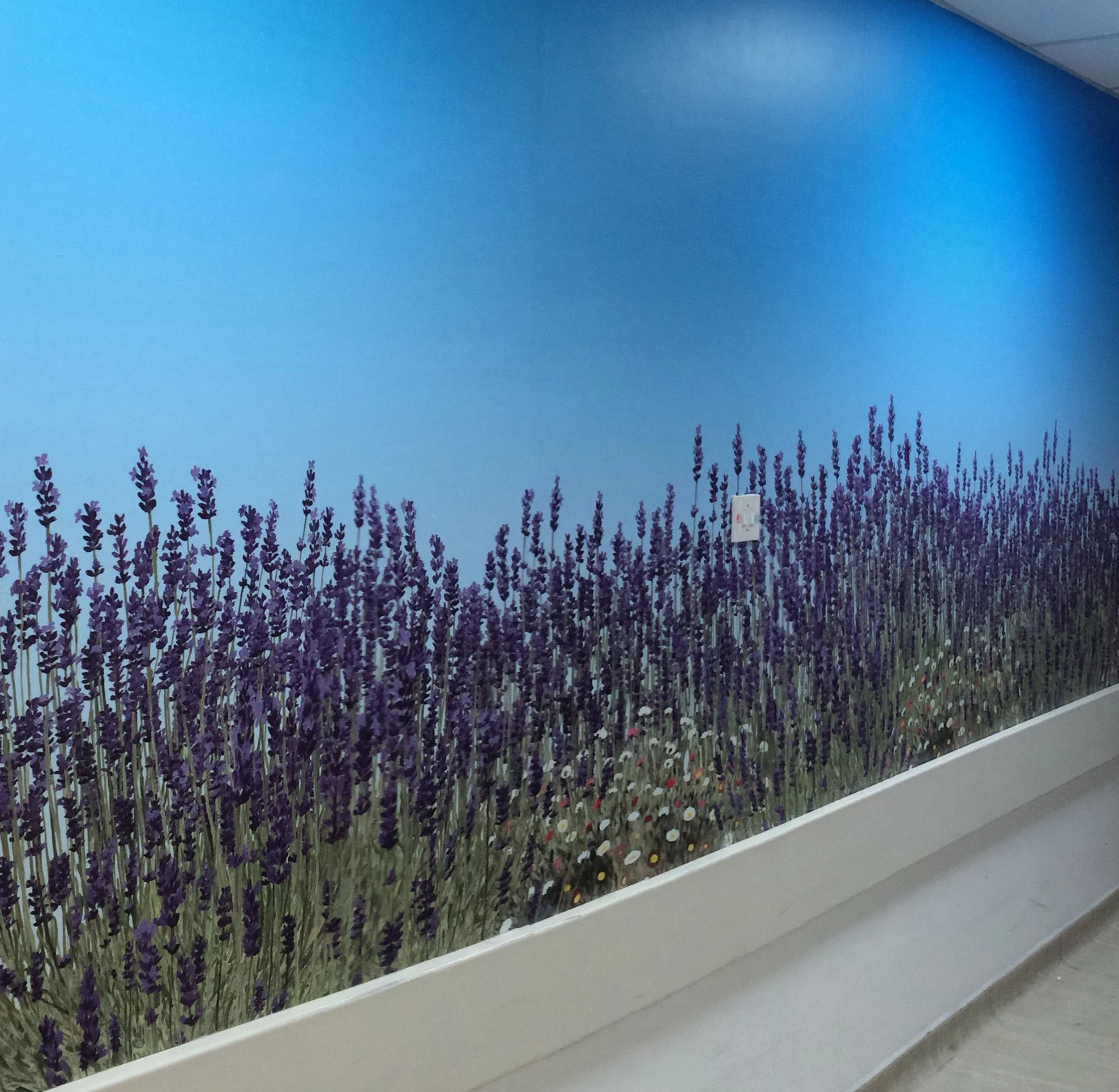 Lavender hedge wall design created for a corridor in Royal United Hospital, Bath, Somerset