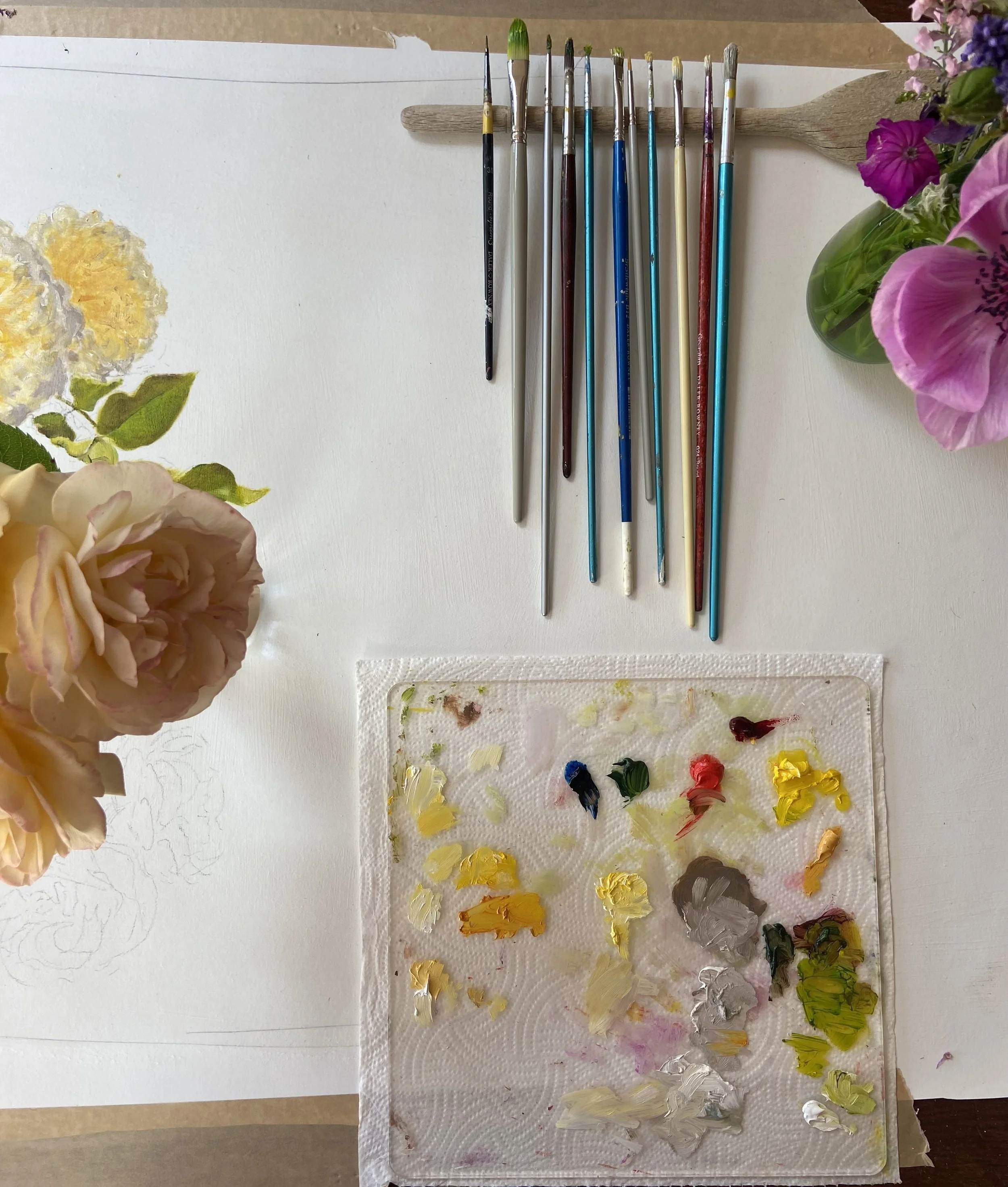 Oil painting of English roses showing under sketch in pencil